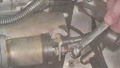 4. Накидным ключом на 13 мм отворачиваем гайку крепления наконечника силовою провода стартера.