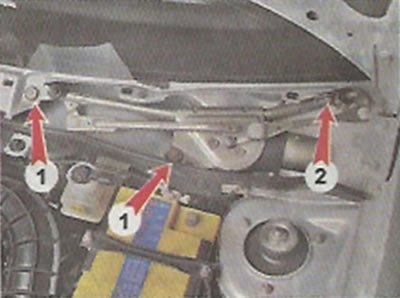 8. Торцовым ключом на 10 мм отворачиваем два болта 1 и гайку 2 крепления стеклоочистителя.
